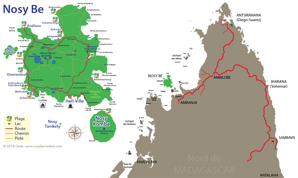 5ème plus grande île mondiale après l’Australie, le Groenland, la Nouvelle Guinée et Bornéo, Madagascar a une superficie de 587 000 km², soit 20% de plus que la France. Cousteau la surnommait le « Pays de l’oiseau Roc » en référence à l’oiseau géant disparu. Elle est éloignée de 400 km du continent africain dont elle s’est détachée il y a 240 millions d’années, par le canal du Mozambique. A 617 km de la capitale Antananarivo, au nord-ouest de l’île principale (Grande Terre) se trouve Nosy Be, petit éden tropical.